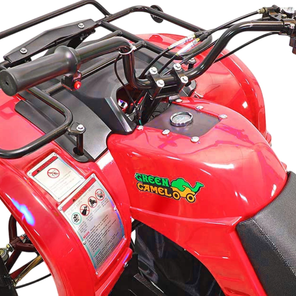 У GreenCamel Caxapa A1520 два вида батарей, можно приобрести квадроцикл с штатной батарей 20 Аh SLA GEL, у которой запас хода 40 км. Ресурс 20 тыс. Км, время зарядки 8 часов. В комплектации есть более мощная батарея 42 Аh Boston, запас хода 80 км. Ресурс батареи 100 тыс. Км, время заряда 16 ч. У квадроцикла отсутствует спидометр, и шнур безопасности на руле.