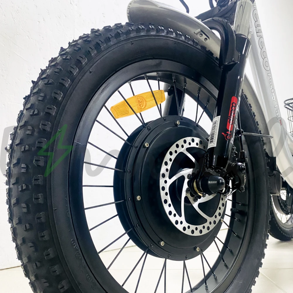 Электровелосипед имеет широкие колеса диаметром 20 дюймов, развивает скорость до 35 км/час, выдерживает нагрузку в 110 кг.