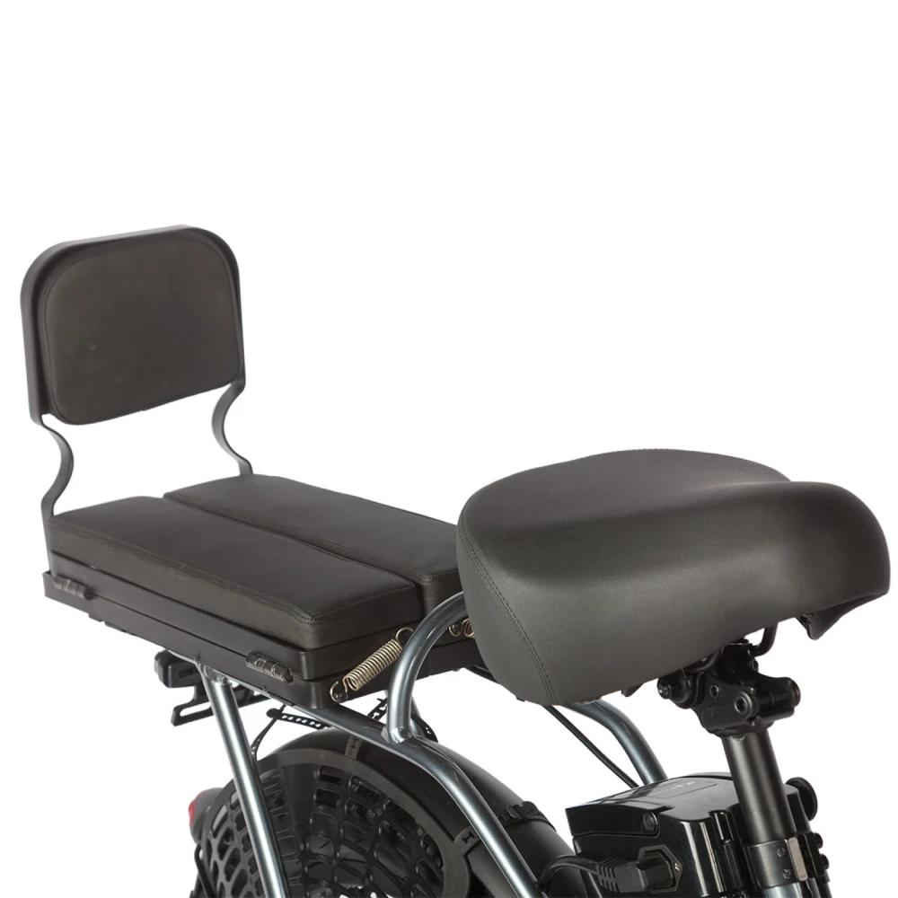 Два сиденья и вместительная корзина позволяют кататься вдвоём или брать с собой всё, что нужно для работы, отдыха или покупок. Быстросъёмный аккумулятор удобно расположен под сиденьем — зарядка станет ещё проще и мобильнее. Тебя выделят современные фишки: яркая фара, задний фонарь со стоп-сигналом и поворотниками, металлические крылья с брызговиками и ручка газа для полного контроля над скоростью.